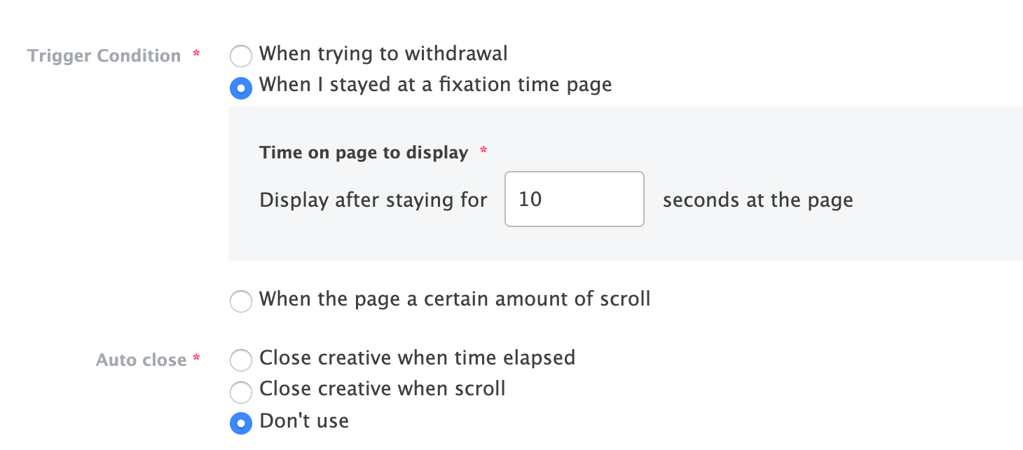 - When no ending conditions are specified, the creative remains displayed until the user clicks the close button.