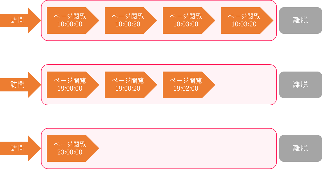 ページを閲覧した時点から30分間次のページを閲覧しなかった場合は別セッションと見なされます。